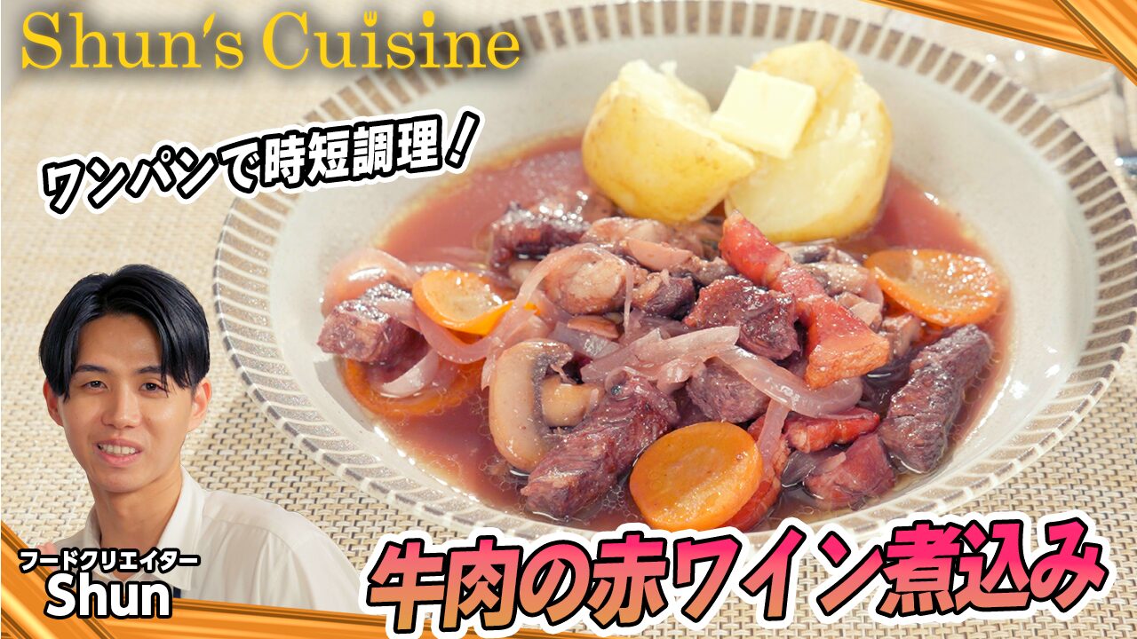 フライパンで時短煮込!牛肉の赤ワイン煮込み